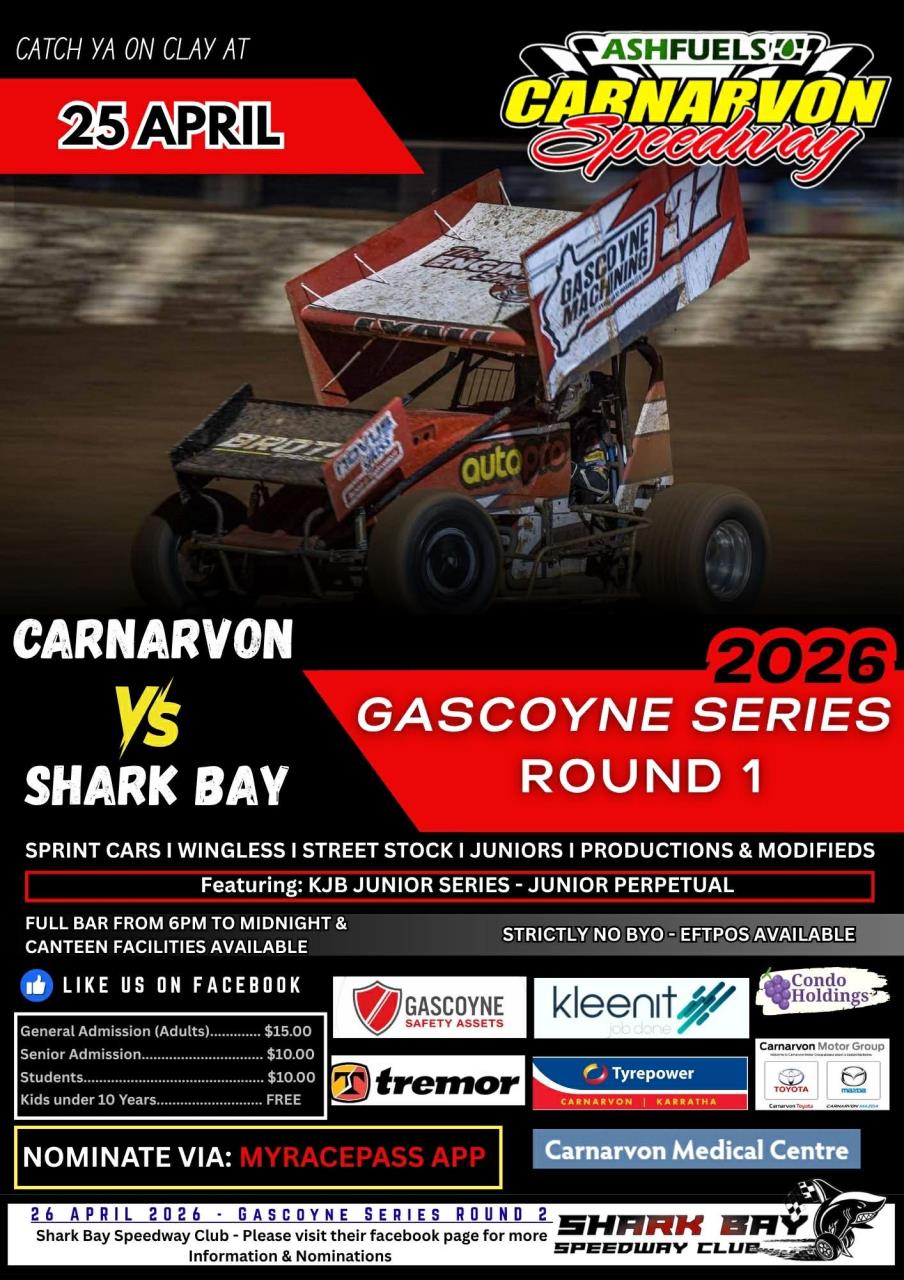 That'ss right two big nights of racing in the Gascoyne. We start with the home ground advantage and then head to Shark Bay Speedway Club to finalise the 2 nights of fun and crown the winners with glory!