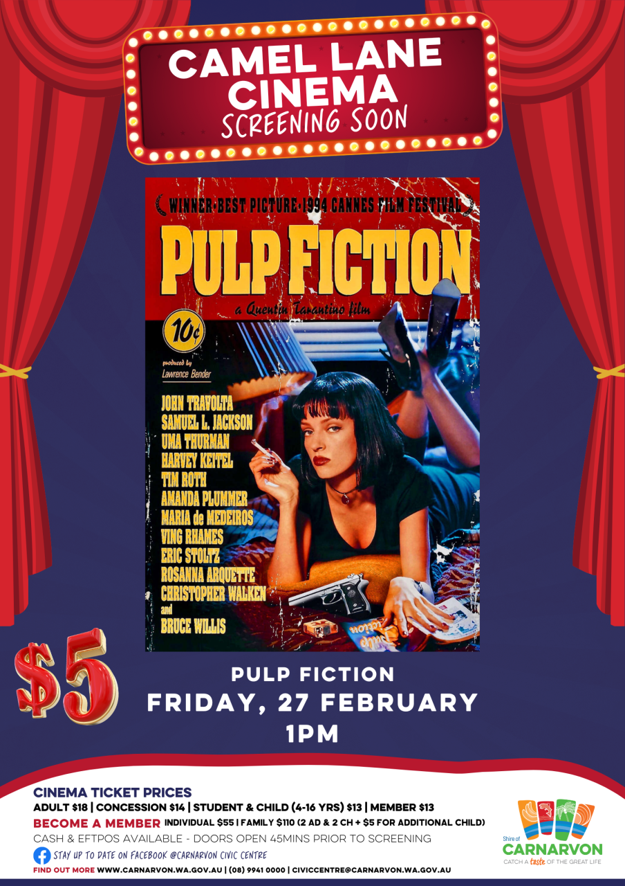 Movie Screening at 1pm followed by a Pulp Fiction Theme night at the Camel Lane Tavern.